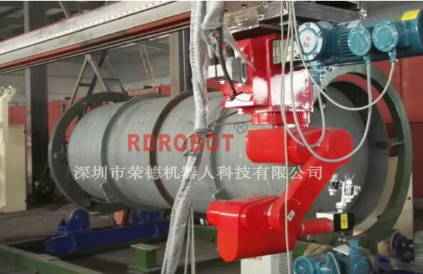 機(jī)器人平移行走,配合機(jī)架整體前后移動,增大了機(jī)器人噴涂范圍,半徑1.3M的機(jī)器人就可以把整個(gè)產(chǎn)品噴好,適用于大型的、笨重的罐體工件,如下圖所示: