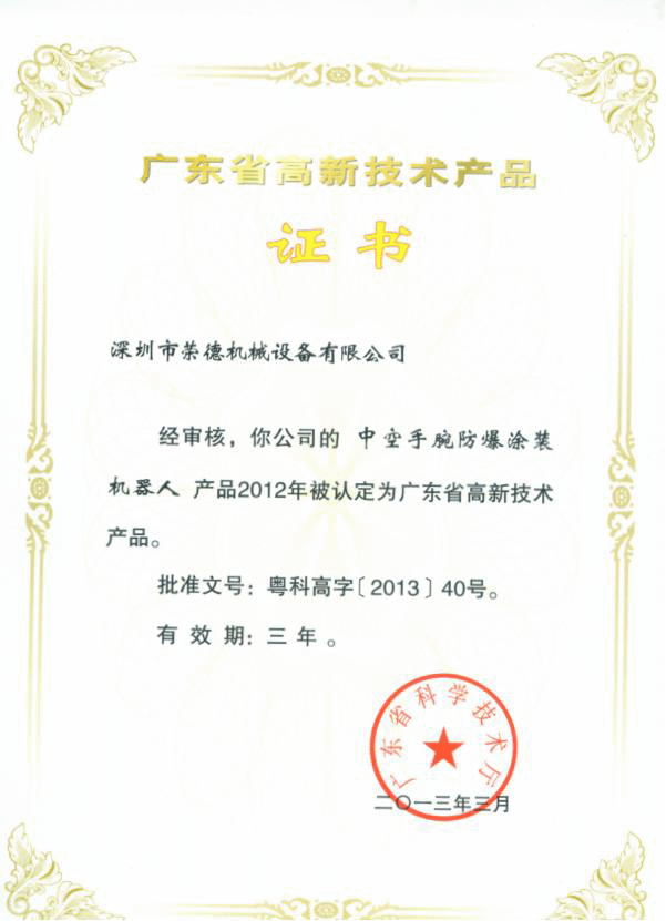 日前,廣東省科技廳公示了獲得“2012年廣東省高新技術(shù)產(chǎn)品證書(shū)”的企業(yè),深圳市榮德機(jī)器人科技自主研發(fā)的噴涂機(jī)器人赫然在目。