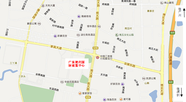 深圳或廣州方向走廣深高速厚街出口下高速,轉(zhuǎn)“博覽大道”再轉(zhuǎn)“會展東路”,到達莞太路和家具大道交叉處即到。導航:廣東現(xiàn)代國際展覽中心、嘉華大酒店