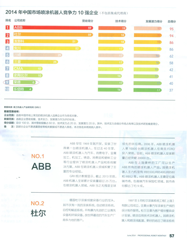 日前,國內(nèi)某權(quán)威機器人產(chǎn)業(yè)雜志對2014年中國市場噴涂機器人的核心市場競爭力進行了深入了解并根據(jù)各企業(yè)營收、技術(shù)、發(fā)展?jié)摿θ椫匾笜诉M行評分,并得出最終排名,榮德公司在所有入圍的十家企業(yè)里面排名第九,排名前八名的均為國外巨頭,榮德公司在中國國內(nèi)的排名中處于第一名的領(lǐng)先地位,這也符合榮德公司“中國噴涂機器人領(lǐng)先品牌”的戰(zhàn)略地位。