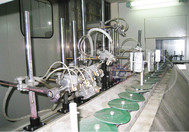 Ω靜電自動噴涂設(shè)備,是將輸送軌彎曲成Ω形,工件圍繞圓盤式靜電噴槍周圍通過,并在噴涂過程中自轉(zhuǎn),圓盤噴槍上下移動進行自動噴涂。由于工件圍繞圓盤噴槍通過,工件相對噴槍的時間較長,允許輸送鏈速度較高,故生產(chǎn)效率較高。圓盤噴槍上下移動行程及速度,可依據(jù)工件外形來調(diào)節(jié),提高涂膜質(zhì)量。