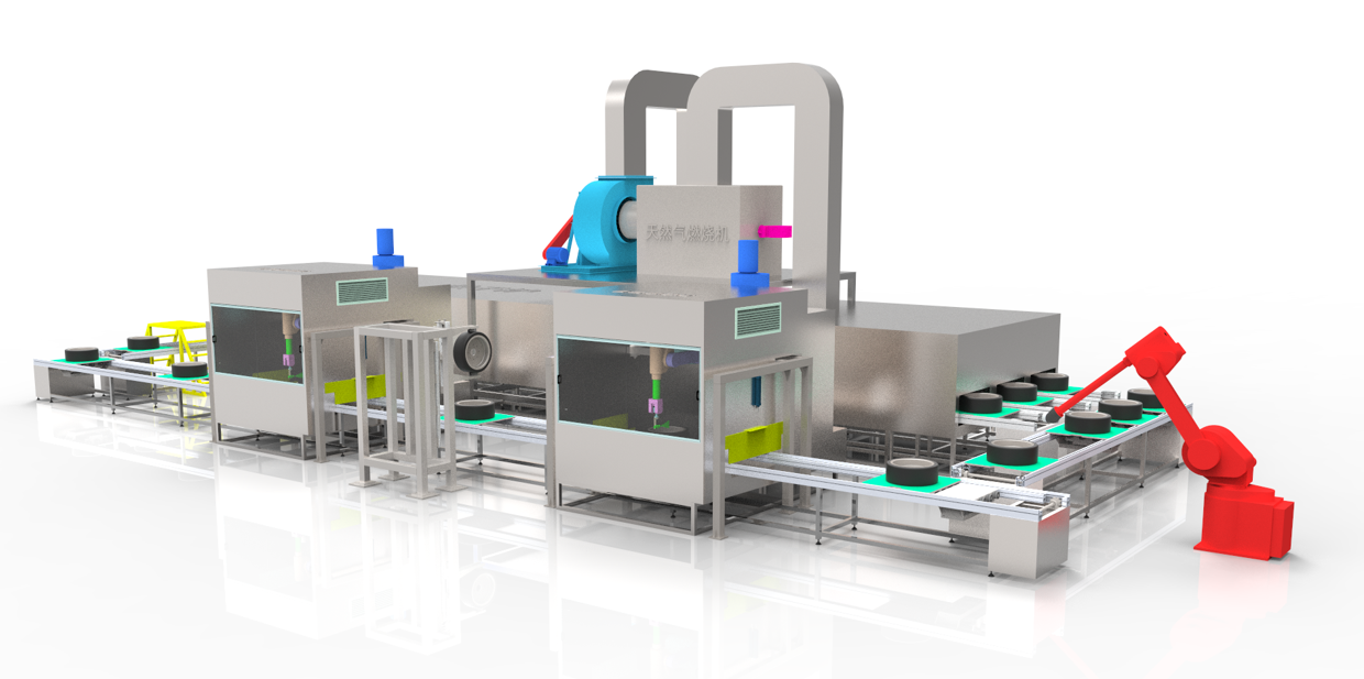 橡膠輪胎機器人自動噴涂線包括自動噴涂輸送線、待料輸送線、自動頂升平移機、工裝板、頂升自轉(zhuǎn)機構(gòu)、RDPT01噴涂機器人、工件檢測系統(tǒng)、機器人機架、水簾水洗式噴漆柜、遮蔽機構(gòu)、自動翻面機械手、噴槍及供油部分、固化爐加熱系統(tǒng)、固化爐、電氣部分等組成部分。